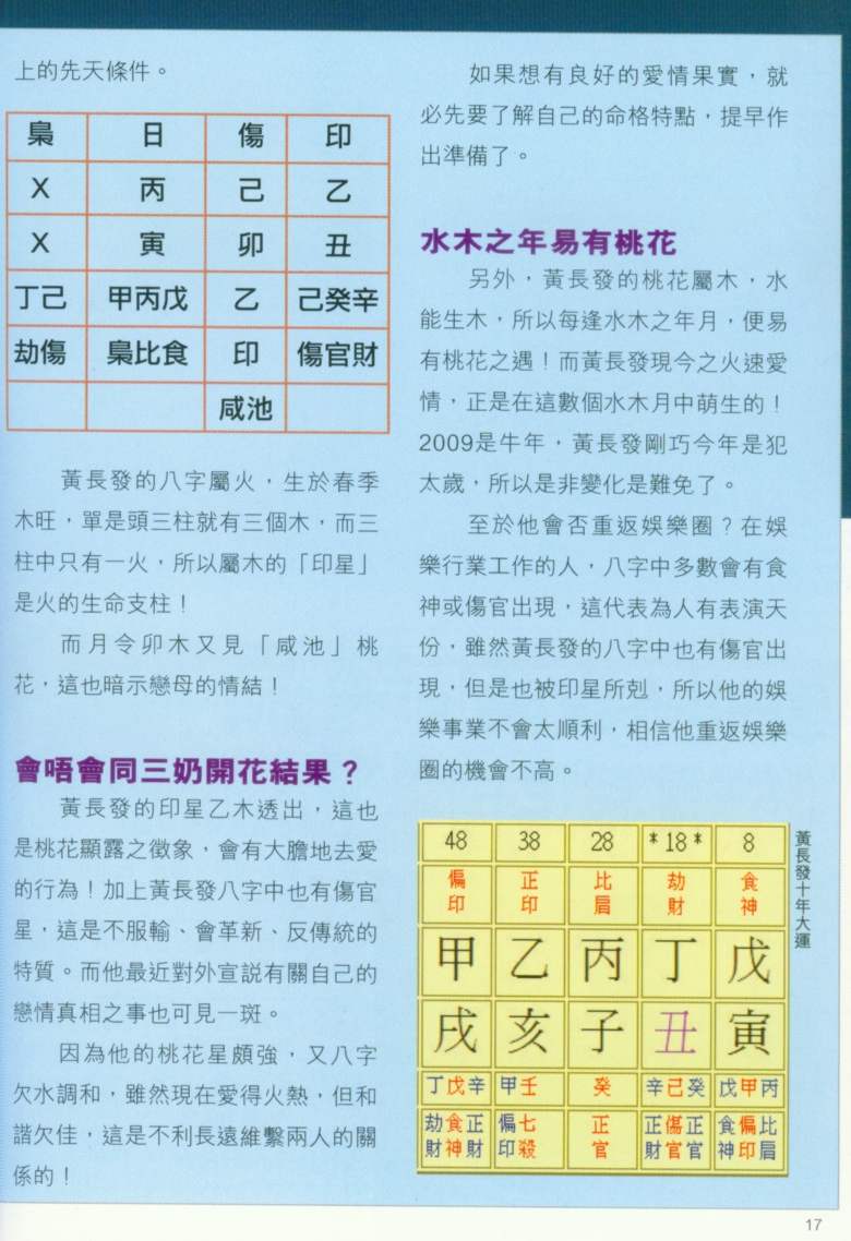 2009年3月 在睇相王 發表 有關〔黃長發 姊弟戀的八字分析〕文章。