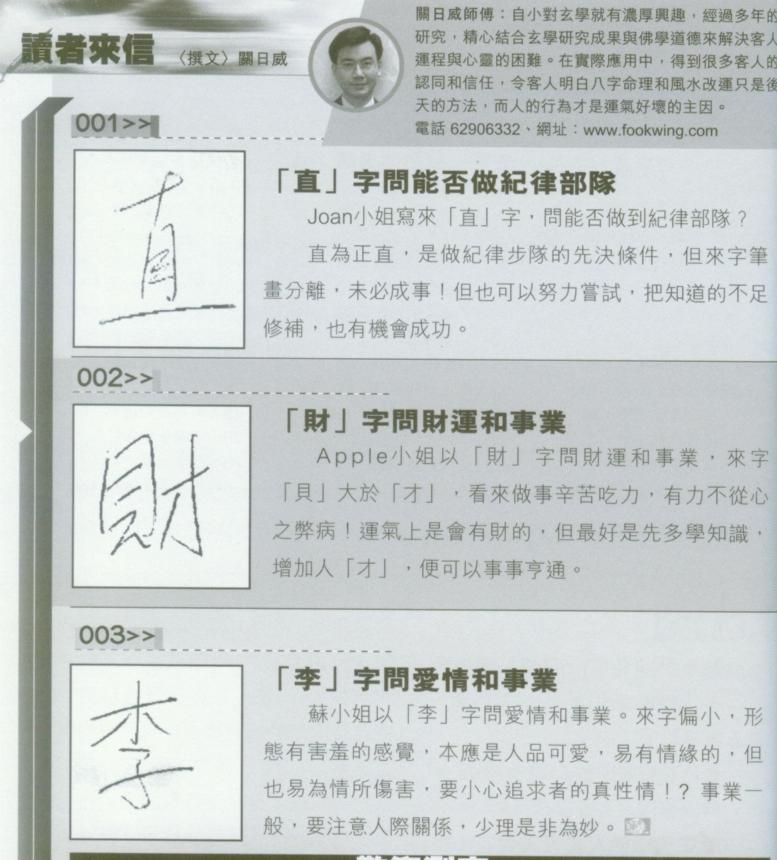2009年4月 在睇相王 發表 有關〔測字〕文章。